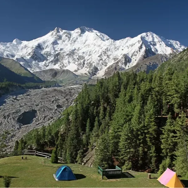 Fairy Meadows is one of Pakistan’s most magnificent mountains, rising dramatically above the lush valleys of the Nagar Valley. Easily visible from the Karakoram Highway, it is famous for its breathtaking close-up views, massive glaciers, and snow-covered peak that towers over the surrounding landscape. Travelers often stop at the Rakaposhi View Point to enjoy.